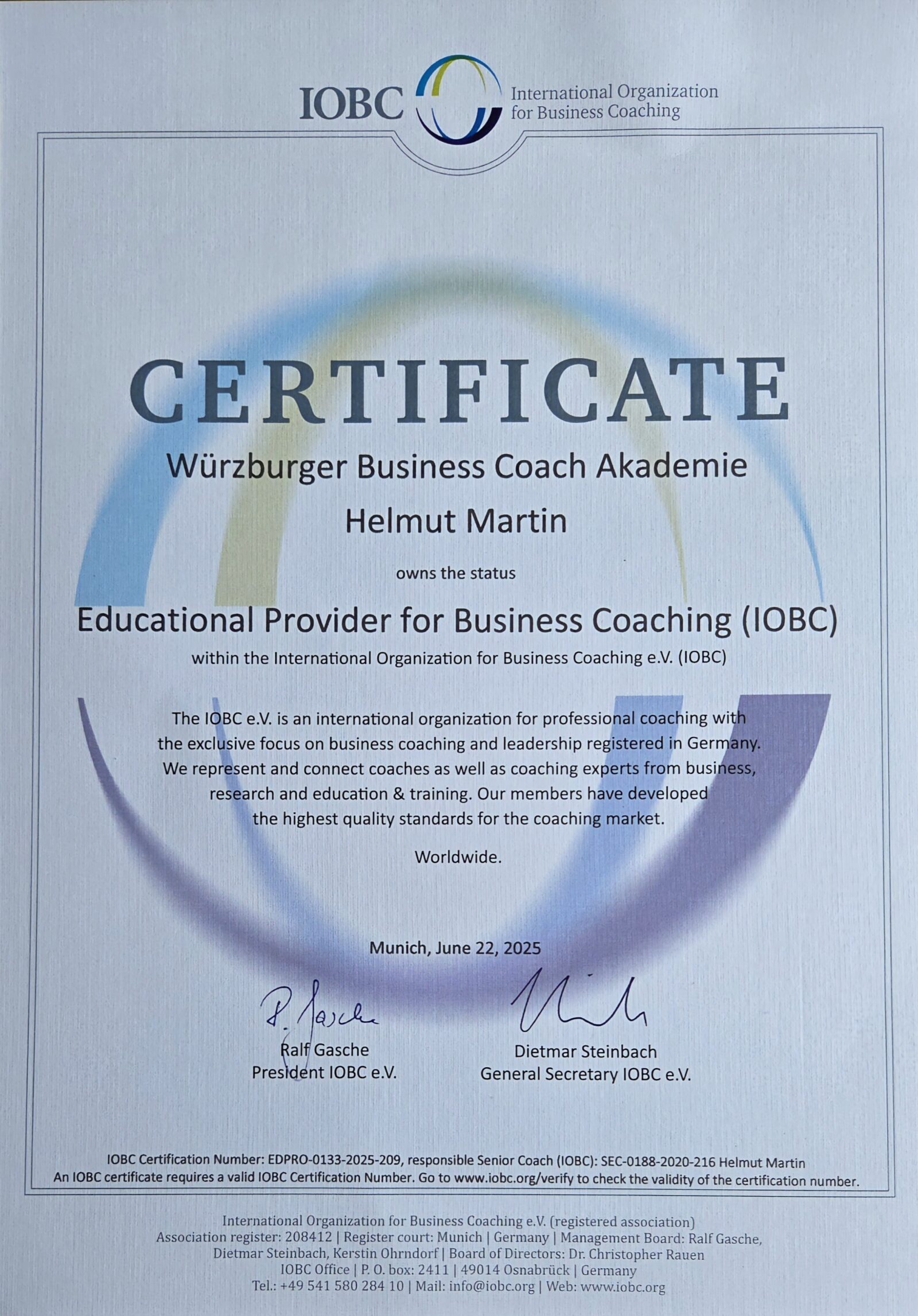 Doch wir gehen noch einen Schritt weiter. In Kürze haben wir auch die internationale Zertifizierung durch die IOBC (International Organization for Business Coaching) – dem internationalen Dachverband für Business Coaching abgeschlossen. Unser Ziel ist es, auch auf internationaler Ebene höchsten Qualitätsstandards nachzuweisen.
